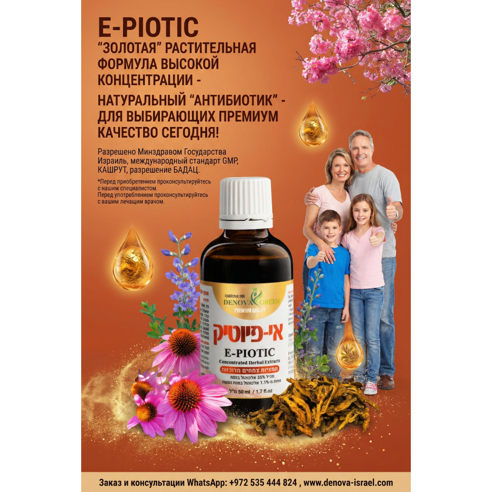 Ведь в действительности, мир находится в определённом тупике, когда люди перестают верить в эффективность медицинских препаратов, когда миллиарды людей обращаются в сторону знаний предков и к помощи растительного мира. Во-многих случаях это имеет реальные обоснования и высокую научно-доказанную эффективность. E-PIOTIC как раз из этой категории «супер» препаратов, он не новый на рынке, однако модернизированный и «отшлифованный» на основании многих существующих клинических исследований входящих в его состав ингредиентов. Специалисты DENOVA создали алгоритм из многих эффективных ингредиентов особо концентрированных экстрактов разных частей растений и это, как всегда, уникальная неповторимая авторская формула от DENOVA GREEN, призванная помочь многим сотням миллионов человек. Ну, что сказать, как всегда из Израиля приходят самые новейшие и эффективные инновации от DENOVA – с этим пора уже давно согласиться. Не успели остыть отзывы из десятков стран о LIVERCLIN, PARACLIN, B-CURCUMIN, IMUTIN, NEWMIN, ASMEGREEN, MEGA-RENOL и других пищевых добавок как появился E-PIOTIC, а его все ждали давно в разных странах, особенно к осенне-зимнему сезону 2016.