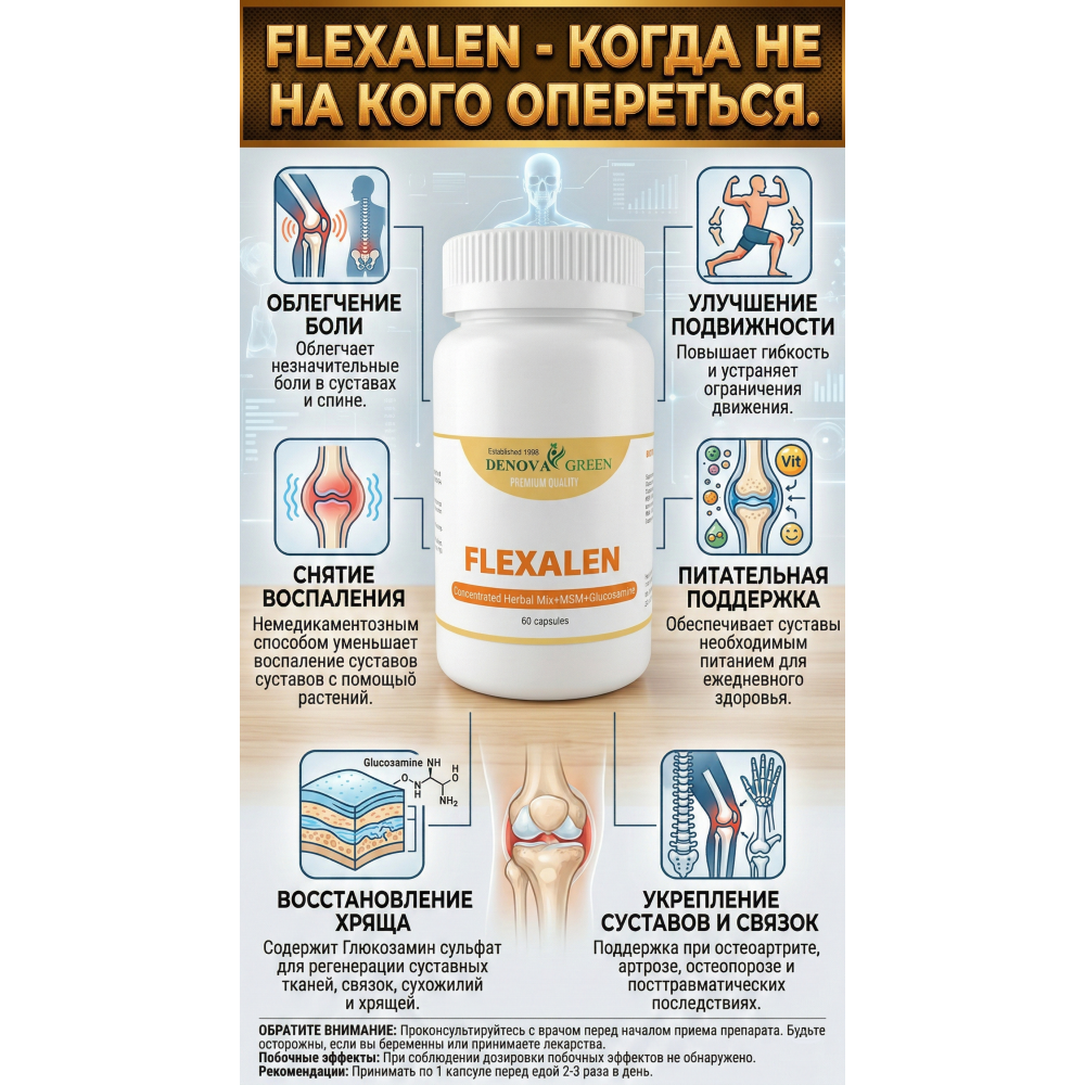 High consumer qualities of the product: FLEXALEN is an excellent product ready to assist with various bone and joint conditions. The packaging design of FLEXALEN attracts consumer attention and encourages purchases. The packaging includes tamper-evident seals and advanced anti-counterfeit measures.